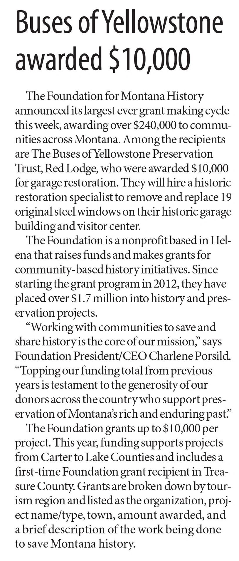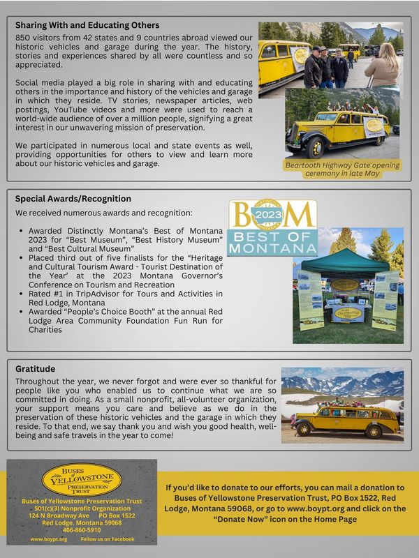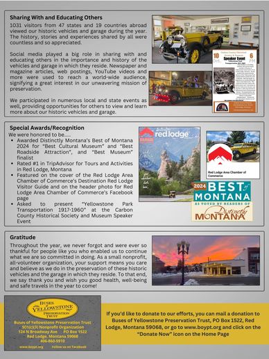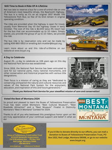 Beyond belief as we learn the Buses of Yellowstone Preservation Trust has been voted Montana's "Best Museum", "Best History Museum" and "Best Cultural Museum" in Distinctly Montana's "The Best in Montana" contest for 2023.